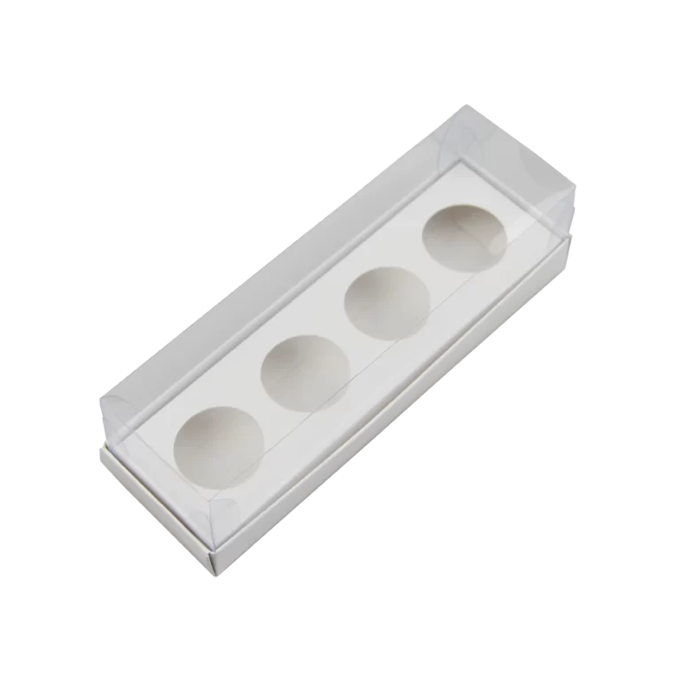 Caixa em cartolina branca para 4 brigadeiros, equipada com tampa transparente que valoriza a apresentação do produto. Uma solução prática e elegante para destacar os seus doces e aumentar o apelo visual junto do cliente.