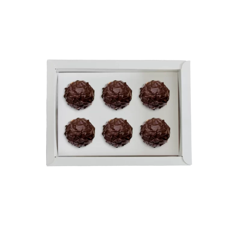 Caixa em cartolina branca para 6 brigadeiros com tampa transparente, concebida para destacar os seus doces com uma apresentação limpa, organizada e visualmente apelativa. A tampa em PVC permite visualizar o conteúdo sem necessidade de abrir a embalagem, aumentando o valor percebido do produto no momento da compra.