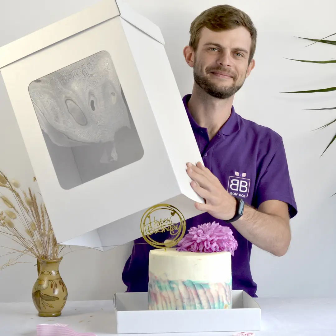 A caixa de cartão para bolos é destinada a embalagem e armazenamento de produtos culinários feitos ou por encomenda. Graças ao cartão resistente e ecológico, nossa caixa pode proteger o seu bolo de danos mecânicos durante o transporte.